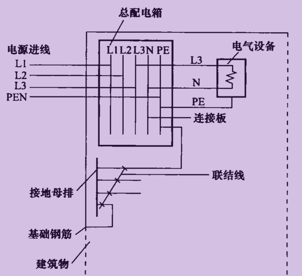 TN-C-S系統(tǒng)中,配電干線在進(jìn)入建筑物后是要直接接至總配電箱的,總配電箱內(nèi)的母線有L1、L2、L3、N和PE排,其中N和PE排往往設(shè)置在配電箱底部,便于進(jìn)出線接線。