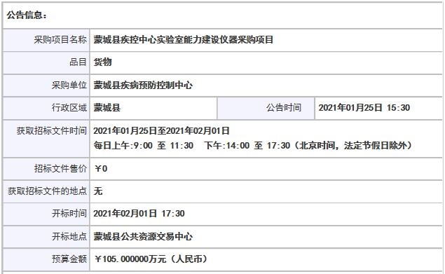本項(xiàng)目投標(biāo)截止和開標(biāo)時(shí)間為2021年2月24日9時(shí),地址為蒙城縣智慧城市中心南樓三樓。本次招標(biāo)預(yù)留的準(zhǔn)備時(shí)間較為充足,希望廣大儀商能積極參與招投標(biāo)活動(dòng),為蒙城縣疾病預(yù)防控制中心提供更多高精尖儀器設(shè)備。