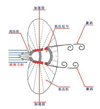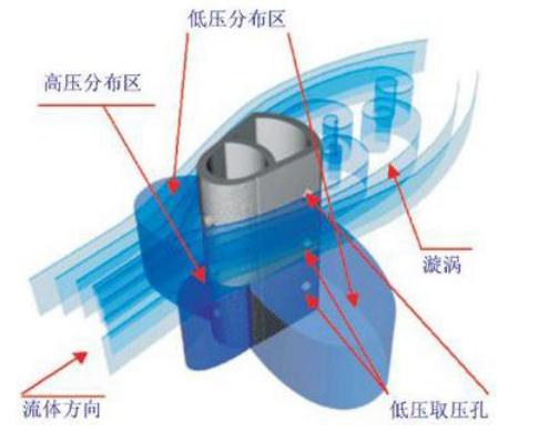 如圖, 低壓取壓孔在傳感器側(cè)后兩邊、 傳感器與流體分離點(diǎn)之前, 既避免了低壓孔受渦流影響, 又避免了低壓孔被堵, 完全實(shí)現(xiàn)了本身的抗堵, 使低壓信號更穩(wěn)定、 精確。