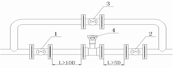 不允許直接在流量計(jì)測(cè)量管前后端安裝閥門、 彎頭等極大改變流體流態(tài)的部件, 如果需要在流量計(jì)前后管道上安裝閥門、 彎頭等部件也應(yīng)盡量保證前后直管段長(zhǎng)度, 直管段要求前10D,后 5D, 對(duì)于新完工的工藝管道, 應(yīng)先進(jìn)行初步吹掃后再安裝流量計(jì)。