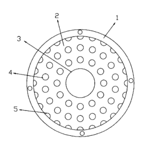 基板(2)為三個(gè)具有非均勻化開孔結(jié)構(gòu)的品種中的一-種:①基板(2)的中心部位具有一個(gè)大圓孔(3) ,基板(2) 的其他部位均勻排布著數(shù)只直徑相同的小圓孔(4) ;②基板(2)上均勻排布有數(shù)只直徑相同的小圓孔(4),但是最外圍的小圓孔(4)與基板(2)的周邊相交而呈現(xiàn)為非整圓孔(5) :③基板(2) 中心具有一個(gè)大圓孔(3) ,基板的其他部位均勻排布著數(shù)只直徑相同的小圓孔(4),但是最外圍的小圓孔(4)與基板(2)的周邊相交而呈現(xiàn)為非整圓孔(5) ;