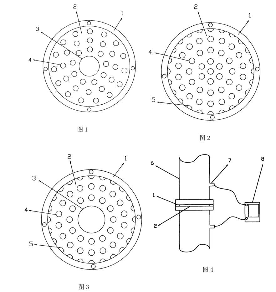不同的基板品種 、不同的大圓孔直徑、不同的小圓孔直徑、不同的非整圓面積、不同的開孔事(多孔板上所有孔洞的面積與基板面積的比率),多孔板具有不同的阻力系數(shù),決定了流量計(jì)顯示的數(shù)據(jù)與管道中流體的流量之間有不同的數(shù)量關(guān)系式,該關(guān)系式事先設(shè)計(jì)和計(jì)算確定,使用時(shí)通過檢測(cè)多孔板前后的靜壓差,可以方便地?fù)Q算出流量值的大小。[01]本發(fā)明中, 所述的流量計(jì)為第一種時(shí),數(shù)值在線測(cè)量直讀,簡(jiǎn)單易用:第二種將壓差轉(zhuǎn)變?yōu)殡妷夯螂娏餍盘?hào),再有配套的二次儀表顯示,便于實(shí)現(xiàn)遠(yuǎn)程在線測(cè)量;第三種的二次儀表要求低,能夠減小二次儀表的配套費(fèi)用。