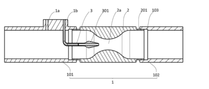 其中,1為主管段;101為進(jìn)口管段;102為出口管段;103為環(huán)形插槽;1a為高壓取壓口;1b為低壓取壓口;2為喉口管段;201為環(huán)形插頭;2a為喉口;3為喉口取壓管;301為水滴形結(jié)構(gòu)。