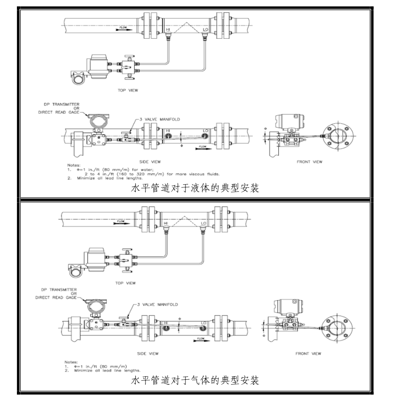 對于楔式流量計的水平安裝方式,取壓口推薦為延管道中心線旋轉(zhuǎn)90。如FIG.1)這種安裝方式可以避免雜質(zhì)以及氣泡在取壓口的存積而對變送器取壓造成的影響。其他安裝方式也可以被采用,但必須考慮變送器處的排污、排氣問題以及引壓管線存在的高度差問題。