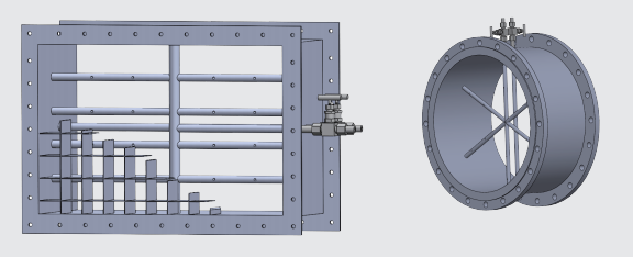 在橫截面測(cè)風(fēng)裝置中內(nèi)置多根風(fēng)速檢測(cè)桿,檢測(cè)桿上迎流方向有成對(duì)的測(cè)壓孔,用來(lái)測(cè)量流體的平均總壓P0,另一組檢測(cè)桿用來(lái)檢測(cè)背流方向或下游管壁上流體靜壓P,用平均總壓和靜壓之差△P來(lái)表示流量。