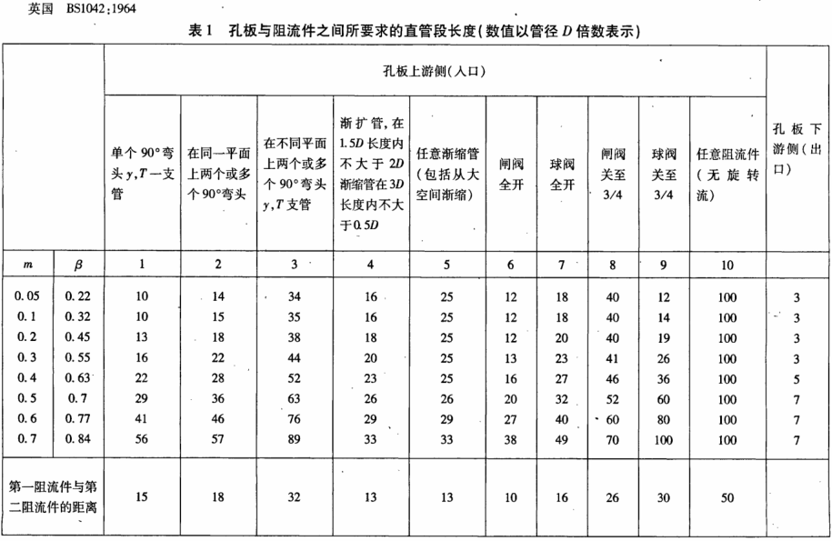 英國(guó)BSl042:1964孔板流量計(jì)直管段長(zhǎng)度規(guī)定如表1所示孔板流量計(jì)直管段長(zhǎng)度規(guī)定歷經(jīng)80余年終于由IS05167:2003(E)獲得統(tǒng)一,其特點(diǎn)可列舉若干如下。
