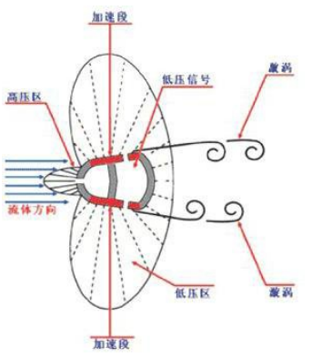 可見: C 為常數(shù), 要確定 Q, 必須確定 K 和 DP如圖所示: 當流體流過傳感器時, 不僅在其前部產(chǎn)生一個高壓分布區(qū), 高壓分布的壓力高于管道的靜壓。 而且流體流過傳感器加速段時速度加快, 在傳感器后部產(chǎn)生一個低壓分布區(qū), 低壓分布區(qū)的壓力低于管道的靜壓。