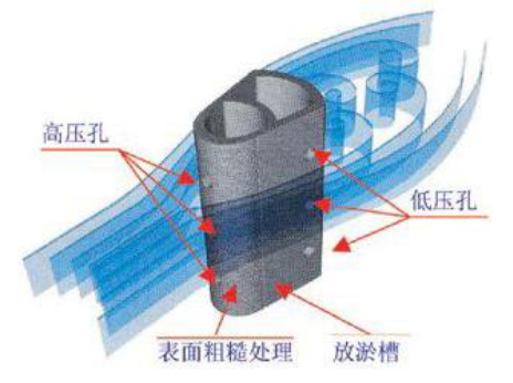 德爾塔巴流量傳感器表面粗糙處理和放淤槽控制傳感器表面的邊界層,使流體速度在較大范圍內(nèi)變化時, 仍能保證流體在傳感器表面的邊界層呈紊流狀態(tài), 使得流體在低流速時傳感器仍可獲得穩(wěn)定精確的信號, 延伸了傳感器量程下限。(見下圖)