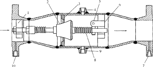 ?。€(wěn)定裝置;2-紡錘形活塞;3-固定孔板;4-排氣孔;5-標(biāo)定和鎖定蝸桿裝置;6-走紙軸支撐;7-低壓側(cè)差壓檢出接頭;8-高張力精密彈簧;9-排水孔;10-高壓側(cè)差壓檢出接頭