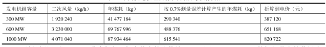 【示例二】電廠鍋爐,過量二次風(fēng)帶走大量熱量,增加煤耗。假設(shè)煙氣溫度120℃,空氣溫度30℃,因二次風(fēng)量測(cè)量精度提高0.7%,按年發(fā)電7000小時(shí)計(jì)算,可以減少煤耗為M*0.24*(120-300)/7000*0.7%,如果發(fā)電煤耗為每度電耗煤300克,每度電電價(jià)0.40元計(jì)算,由于采用平衡流量計(jì),提高測(cè)量精度而節(jié)省的燃煤和降低的費(fèi)用如表3所示。