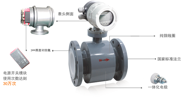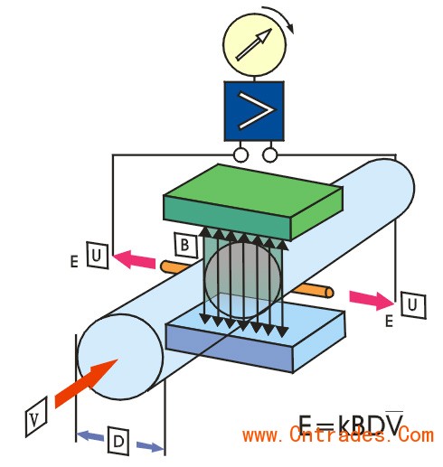 電磁流量計是是基于法拉第電磁感應(yīng)定律工作的,在與測量管道軸線和磁力線相垂直的管壁上安裝了一對檢測電極,當(dāng)導(dǎo)電液體沿著管道軸線流動時,導(dǎo)電液體切割磁力線產(chǎn)生感應(yīng)電勢,此感應(yīng)電勢由兩個檢測電極檢出,數(shù)值大小與流量成正比關(guān)系,其計算公式為: