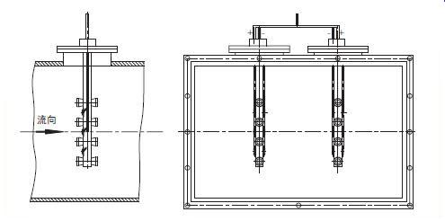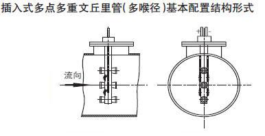 根據(jù)其插入點(diǎn)數(shù)的不同分為單點(diǎn)多喉徑流量測(cè)量裝置和多點(diǎn)多喉徑流量測(cè)量裝置兩種結(jié)構(gòu)。結(jié)構(gòu)圖如下: